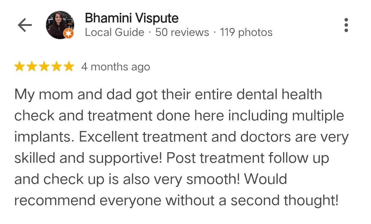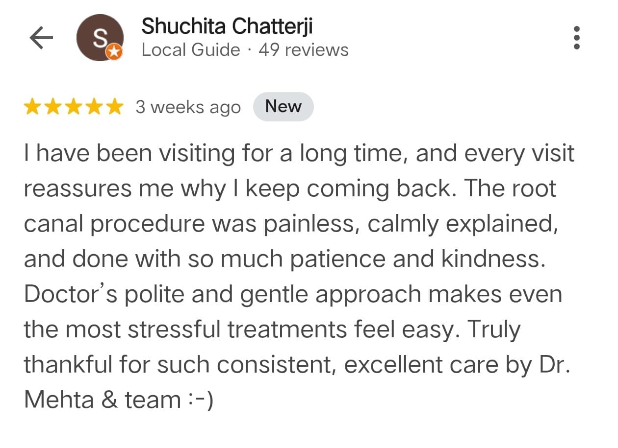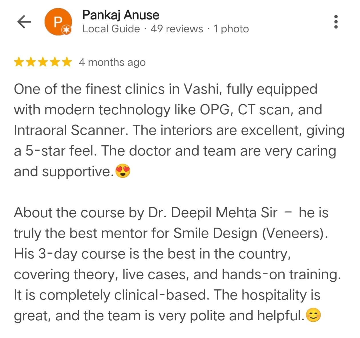 For over four decades, patients across Navi Mumbai and adjoining suburbs have trusted our center for reliable dental care. A 4.9-star Google rating reflects the long-term satisfaction and confidence our patients place in us.